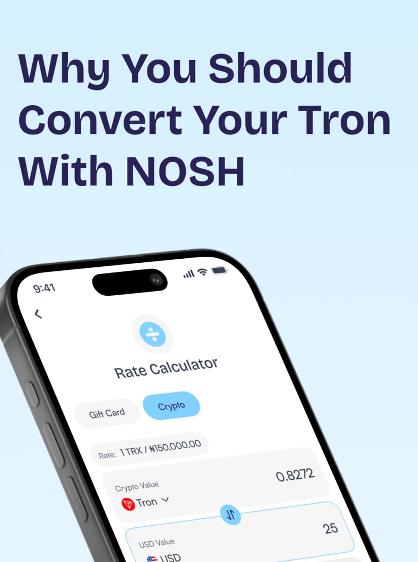 Nosh allows you to convert your BTC, LTC, DOGE, USDT (Tether), Tron (TRX), ETH, BNB, and USDC to Naira or Cedis.